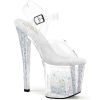 8" (195mm) Heel, 3 3/4" (95mm) Platform Ankle Strap Sandal with Glittered Prismatic Linear Design at the Platform Front and Back of Heel Featuring the Platform Bottom Infused with Flowing Liquid and Floating Holographic Glitters