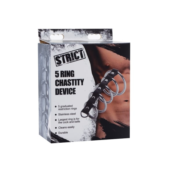 xplore your chastity fantasies with a unique device for your pleasure and amusement! Squeeze the cock and balls of your submissive into the base ring and slide the rest of his penis through the other four rings. If he gets an erection, the rings will be tight against it, constricting him painfully for your enjoyment. The small D-ring on the end allows you to attach weights or other BDSM accessories to tease and torment your pet.