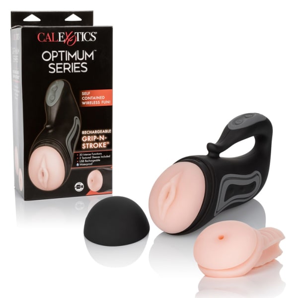 The Optimum Power Rechargeable Grip-N-Stroke is a fully self-contained vibration power stroker packed with 30 functions of vibration, 2 removable sleeves and pressure sensitive squeeze pads for a completely customizable stroking experience. Pressure sensitive squeeze pads customize tightness with every stroke, while 30 functions of vibration tight and tease you towards new climactic heights.