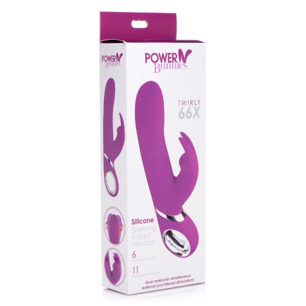 Experience the rotating power of a spinning rabbit with the Power Bunnies Twirly dual stim rechargeable vibrator. Packed with 66 insane combinations, this is the craziest bunny around. 6 rotating head vibrating speeds and 11 rabbit stim vibration patters that will shock your senses. Customize your vibrations with 2 independent motors. Turn the rabbit motor off for deep shaft vibes or turn the shaft motor off for crazy clit action, or turn both motors on for maximum rabbit action. Luxurious silicone is softer than velvet with hair raising vibrations that will make your body melt. Rechargeable and comes with a handy travel friendly USB cable included. Clean with your favorite toy cleaner.