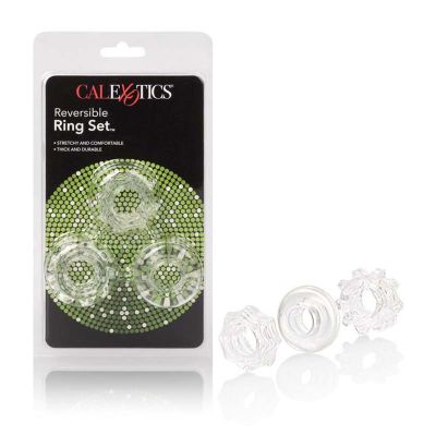 Spice up the night with the versatile Reversible Ring Set. The 3-piece set of erection enhancers is ideal for maximizing your erotic pleasure, and can be comfortably worn during foreplay fun or while enjoying solo play. The easy to use stretchy rings are thick and durable, and perfect for first time and experienced users. The fully reversible trio features tantalizingly textured ridges and sensual grooves for enhanced sensations during stimulation action. The supportive rings are designed to comfortably glide into place to provide stamina support, for extended ecstasy and an explosive climax. Let your imagination run wild. Use them individially as erection, scrotum, and full coverage rings. Try them together for a thicker ride. The options are endless as you prepare for ultimate mind-blowing pleasure and an unforgettable encounter. To heighten sensitivity even further, always use a quality lube with this enhancement toy. Before and after play, clean the erection keeper rings with mild soapy water or a toy cleaner spray.