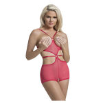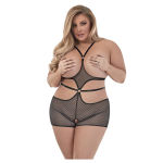 Description: From the Exposed by Magic Silk collection, this style includes: a crotchless open back romper featuring a non-restrictive, open cut design, gold tone O-ring details, adjustable shoulder straps with gold tone sliders, adjustable decorative midsection straps with gold tone O-ring details, attached short style bottom, and hook and eye closure in back.