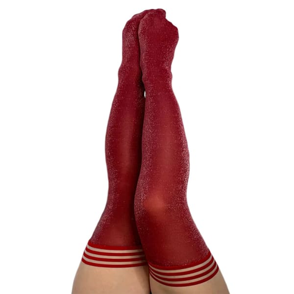 Holly Cranberry Sparkle Thigh Highs are all about Fashion, Fun and Freedom and they are just as comfortable at work or play. The strong but gentle silicon-grip band keeps them in place. And, best of all, Kix'ies are built to last. No matter their size, shape or age, every woman deserves to feel comfortable and have fun, these are not your standard one size fits most style thigh Highs. We know that not every body is created the same, so we created 4 sizes to fit all shapes and ensure a " stay-up fit."