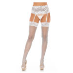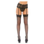 Spice up your lingerie look with these sexy garter stockings featuring a high waisted lace garter belt, adjustable garter straps, and lace top thigh high stockings with an all over fishnet, and an over the toe style. (Panty not included.)
