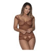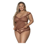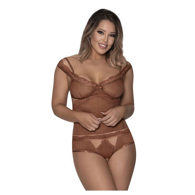 Description: From the Exposed by Magic Silk Collection, this style includes: a cami featuring cutout designs on each side, lace trim in the front and sides, adjustable shoulder straps with gold tone sliders in a lace and elastic 2-strap design on each side, and a matching crotchless lace trimmed panty, with a peek-a-boo design in the front, in a boyshort style.