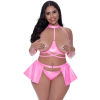 From the Exposed by Magic Silk collection, this style includes: a cupless halter bra featuring hook and eye closure in the back, a neck strap with a silver tone swan hook closure, a cross-strap with a silver swan hook closure, clear o-ring details, a flyaway skirt with front and back exposure, and a matching thong. Sweet bubblegum pink meets slick and slippery wet-look fabric.