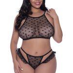 From the Exposed by Magic Silk collection, this style includes: a halter top featuring elastic adjustable shoulder straps with black tone sliders, two back straps with tie-back closure, star designs across stretchy mesh, and a matching cheeky panty with two elastic hip straps and ruffle designs. Shooting stars in playful designs and stretchy black mesh.