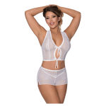 Description: From the Exposed by Magic Silk collection, this style includes: a unique bralette featuring a functional ribbon tie closure with front hook closure for additional support, wide shoulder straps and a peek-a-boo design in back, and a matching flowy boyshort with mesh and lace accents.