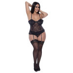 Description: From the Exposed by Magic Silk collection, this style includes: a corset-style bustier featuring hook and eye closures along the back, elastic adjustable shoulder straps with black tone sliders, a satin black bow detail, attached adjustable garter straps with black tone sliders, and a matching lace G-string.