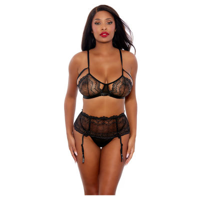 Play naughty games with your babe in this beautiful bra set featuring sheer scalloped lace cups with strappy bust detailing, an elastic underbust band, adjustable spaghetti straps, a hook and eye back closure, a matching garter belt with a high waist, adjustable garter straps, and a matching panty.