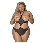 Description: From the Exposed by Magic Silk collection, this style includes: a cupless teddy featuring a non-restrictive open-back design, an elastic and adjustable halter strap with gold-tone sliders and swan hook closure at the neck and back, gold O-ring details, large side cutout accents, and a crotchless cutout.