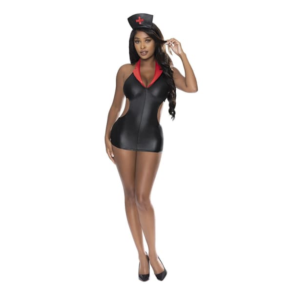 Description: From the Exposed by Magic Silk Collection, this style includes: a black halter dress featuring side and back cutouts, red collars, and a matching black and red head. Band.
