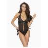 Be unwrapped by your lover in this risqu ribbon teddy. Featuring a plunged neckline, all-over sheer mesh, halter straps, high cut sides, and a thong cut back.