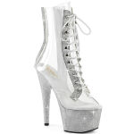 7" (178mm) Heel, 2 3/4" (70mm) Platform Peep Toe Lace-Up Front Ankle Boot Featuring Silver AB Rhinestones Encrusted All-Over the Entire Platform Bottom