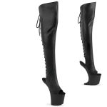8" (200mm) Heelless, 3" (76mm) Platform Open Toe/Heel Lace-Up Back Ove-the-Knee Boot, Full Length Inner Side Zip Closure. Can be Transformed into a Mini Wedge Boot with the Included Heel. "Warning: Extreme Height and Unique Heelless Design. Not Recommended for Walking or Dancing."