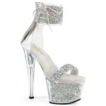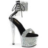 7" (178mm) Heel, 2 3/4" (70mm) Platform Close Back Ankle Cuff Sandal w/Side Lacing Featuring Silver Multi Rhinestone Embellished Ankle Cuff & Toe Strap and Inserted in the Platform Bottom, Back Zip Closure