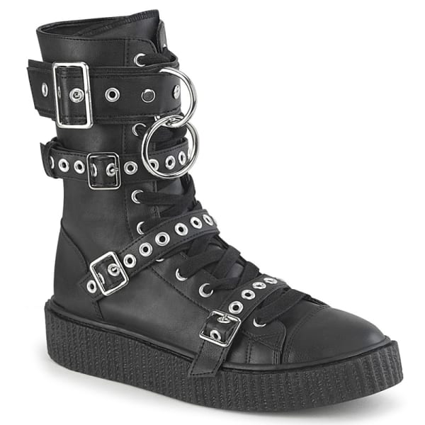 1 1/2" (38mm) Platform Rubber Sole Round Toe Lace-Up Front Mid-Calf Creeper Sneaker Boot Featuring 4 Eyeleted Buckle Straps and Hanging O-ring Center Top Strap, Full Inner Side Metal Zip Closure Closure