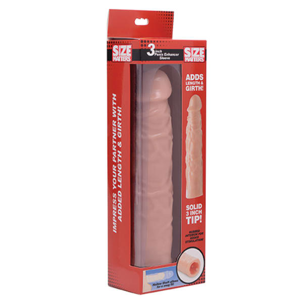 Gain three inches of solid length and about an inch of girth with this penis enhancing sleeve! The firm, but flexible material feels realistic, with a bold head and bulging veins all down the shaft. Just lube up and shove your dick inside to give your partner a new sensation to try out during sex! The solid 3 inch tip is followed by a hollow interior that allows for a snug and secure fit. You will love the huge nubs massaging your member on the inside. Create a custom fit by trimming the bottom of the sleeve to the perfect size! This material is compatible with silicone and water-based lubricants. Use warm water and mild soap or a toy cleaner to clean after use.