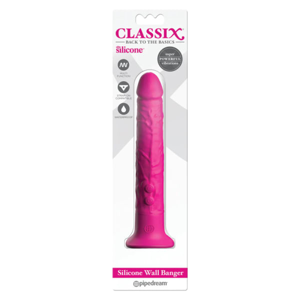 Indulge yourself with the simple pleasures of a classic! With ten vibrating functions, a powerful suction-cup base, and a sturdy realistic design, there's a lot to love about this Classix Silicone Wall Banger! The lower button turns on the strong motor and the upper button cycles through ten intense pleasure functions, while the incredible grip of the suction-cup base holds the dildo securely in place, providing thrilling stimulation right where you want it. Stick the dildo to the floor, wall, bedpost, or almost any flat surface to enjoy wall-bangin' satisfaction with each passionate thrust. And the Classix Silicone Wall Banger is conveniently waterproof Try it in the spa or shower and turn bath time into pleasure time!
