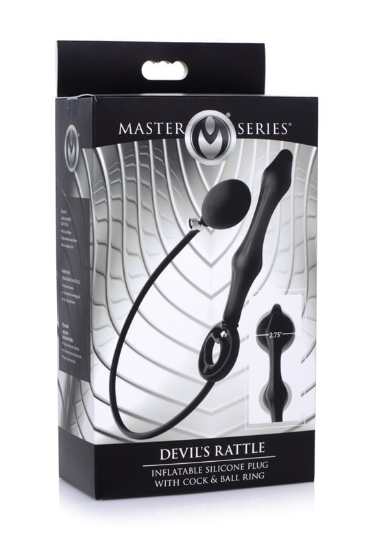 This inflatable silicone plug has it all! The Devils Rattle is an anal toy packed with unique features to satisfy your kinky wants and needs - featuring an inflatable plug, flexible cock and ball ring, and internal balls to rattle and drum against your anal internals with every movement. This silky anal delight is perfect for players looking for a versatile toy that checks all kinds of boxes!