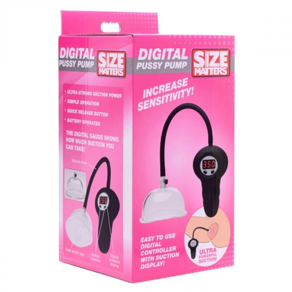Increase size and sensitivity in your vulva with this digital pussy pump! The clear cylinder provides easy viewing as you watch your inner and outer labia get plumper and plumper as the number on the gauge gets higher and higher. The ultra-strong suction power is easy to control with the simple button controls. A quick release button allows you to rapidly free yourself from the intense pressure, leaving your swollen, sensitive vulva available for play. Alternatively, you can remove the hose and keep the cup suctioned on after you have achieved your desired results.