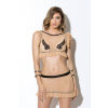 Ruffled fishnet bra and half slip set with Venice lace applique, contrast trim, adjustable straps, and hook and eye closure.