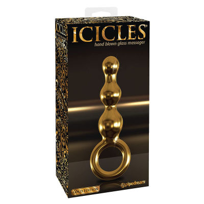 The exquisite Icicles Gold Edition takes the sensual art of glass making to a whole new level of luxury with sophisticated styling and an elegant gold finish. Hand-crafted with amazing attention to detail, each Icicle is sleek, unique, and made to last a lifetime. Perfect for anal play, this luxurious glass wand has a rounded tip to ease insertion while the graduated bulbs offer thrilling stimulation. The ergonomic ring at the base offers easy handling and ensures it won't slip too far inside, while still fitting comfortably between your cheeks. The hypoallergenic glass and finish is nonporous, body-safe, and made to play hard. Run it under warm water to heat things up, or chill it in ice water for a cool sensation. Elegant, upscale, and hand-crafted with amazing attention to detail, this luxurious line of glass massagers will leave you breathless. Each hand-blown Icicle glass wand is sleek, unique, and made to play hard. The hypoallergenic glass is nonporous and body safe, and when cared for properly, is designed to last a lifetime. Run the wand under warm water to heat things up. Chill it under cold water or put it in the freezer for a cool sensation. Since glass is nonporous, cleanup is a snap. Use Pipedream Toy Cleaner and warm water for a worry-free wash after the fun. Length: 5.8 (14.7 cm) Insertable Length: 4 (10.1 cm) Width: 1.3 (3.3 cm)