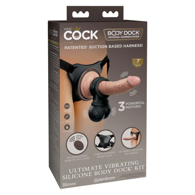 NO RINGS, NO SNAPS, NO HASSLE! The patented Ultimate Vibrating Silicone Body Dock Kit includes everything you need to take strap-on play to a whole new level! The included King Cock Elite silicone dildo is made from high-quality, dual-density Elite Silicone and features 10 modes (3 speeds, 7 functions) of powerful stimulating vibrations with a simple one-button operation. The dual-density Crown Jewels vibrating balls feature dual-density Elite Silicone, 10 modes of powerful vibration, and a super stretchy c-ring that turns most dildos, vibrators, and even cocks into an instant rabbit vibrator! The included wireless remote controls both the vibrating dildo and The Crown Jewels simultaneously for hands-free fun!