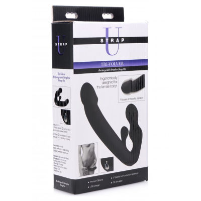 Both partners receive powerful pulsating pleasure from this double-sided strapless strap-on. A slender shaft, clitoral stem, dual bulbs for the wearer, and 7 incredible modes of vibration set this beautiful strapless strap-on apart! This rechargeable pleasure tool features dual motors to provide you with 3 speeds and 4 patterns of powerful internal thrumming. The single control button is easy-to-use and accessible during penetration. Both ends of this artfully designed double dildo are shaped for the ultimate in ecstasy: the smaller end features two smooth swells while a protruding stem massages the clitoris. Meanwhile your partner will be treated to a narrow, comfortable shaft with a bold coronal ridge. It is even waterproof so that you can take your play into the shower, bath, pool, and more! Explore greater intimacy with a vibrating double-ended strapon dildo. Made of silky silicone, the Tri-Volver is non-porous and phthalate-free. Clean with mild soap and warm water and avoid use with silicone lubricants.