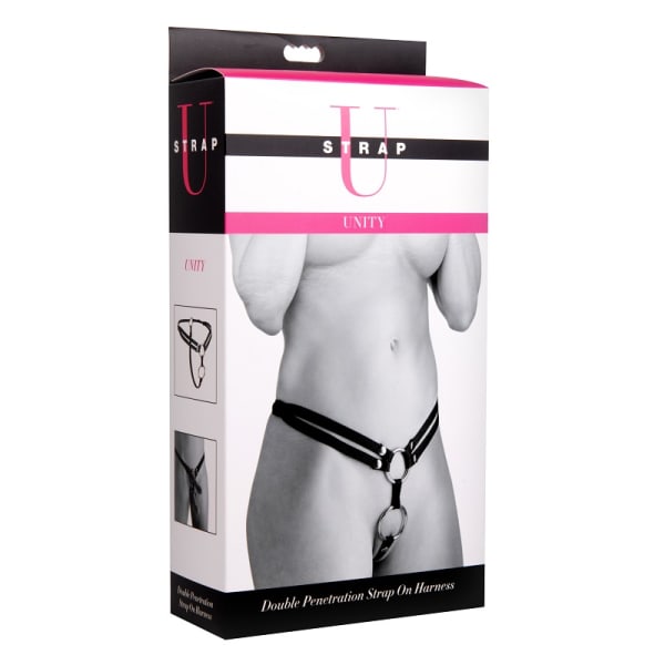 With the Unity Harness System, you can give your partner the ultimate double penetration experience. The dual ring design allows you to use your imagination as to what accessories to use . The straps snap onto the double ring to hold it in place. Comes with two sets of O-rings, metal for weight and rigidity, or silicone for a little bit of stretch and give. The comfortable and fully adjustable nylon harness easily fits up to a 60 inch waist circumference. Just cinch down the straps, either set of rings are designed to hold your toys firmly in place even when the action heats up. Use one or both rings, either as a strap on harness or as a double penetration cock ring harness for men. This versatile harness system boasts a world of penetration possibilities for the ultimate in DP strap on adventures.