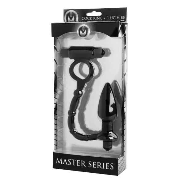 Tease them with double the pleasure...This dual stimulation cock ring and anal plug combo comes to you with devious pleasure for his cock and his ass. Enhance his erection with a vibration ring that connects to a delicious vibrating butt plug, allowing you to tease his most sensitive areas with waves of sensory pleasure. Made entirely of premium silicone, and powered by two independent vibrating bullets. Take it in the shower, this darkly sexy toy is splash proof!
