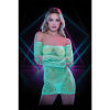 There is no such thing as too over-the-top, but if you want to make a statement, make it with Lapdance and this glow-inthe-dark mini-dress! Designed in a sheer, glow-in-the-dark mesh, the long-sleeved, off the shoulder look features an intricate pattern - a look that really lights up as the lights go down, revealing the neon glow!