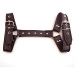 Leather halter harness is fashioned with leather straps and O-Rings. The front is adjustable with buckled straps. Finished off with flat studs on the back. Chest Size Small: 35-37 inches